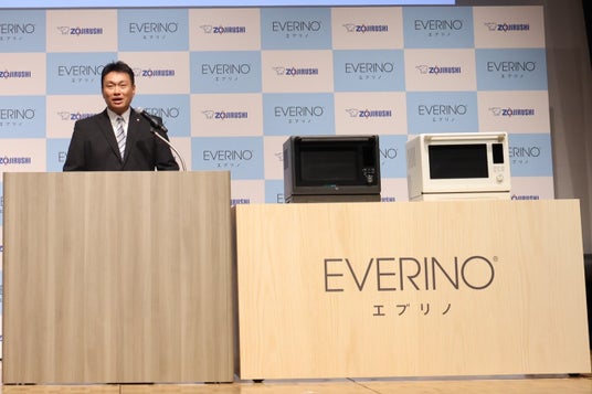 発表会冒頭では、代表取締役 社長執行役員 市川典男が登壇。「EVERINO」は“本当に使ってもらえるレンジ”をコンセプトに開発された製品であると語りました。今回、新たに30Lモデルの発売でフルラインアップが揃い、象印がいよいよオーブンレンジ市場に“本格参入”することを宣言。
