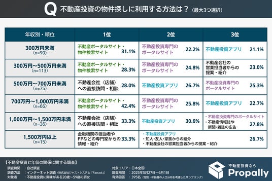 アプリへの高い関心が示される中、実際の物件探しではどのような方法が選ばれているのでしょうか。次の表は、投資対象の物件を自分で探す際に利用する方法について、年収別に上位の回答をまとめたものです。