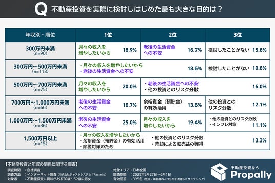 不動産投資プラットフォームの開発・運営を行うPropally株式会社( https://propally.co.jp/ )(本社:東京都港区、代表:齊藤郁織)は、個人の年収と不動産投資への意識・行動の関連性を明らかにするため、不動産投資に関心のある男女395名を対象にアンケートを行いました。本調査では、不動産投資の裾野がミドル層へと広がり、デジタルツールを駆使した堅実な資産形成が新たな潮流となっていることがわかりました。