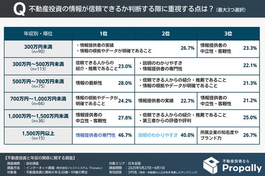 最後に、こうした情報収集や物件探しを行う際、どのような基準で情報の信頼性を判断しているのでしょうか。次の表は、不動産投資に関する情報源やアドバイスを「信頼できる」と判断する際に重視する点について、年間所得別に上位の回答をまとめたものです。