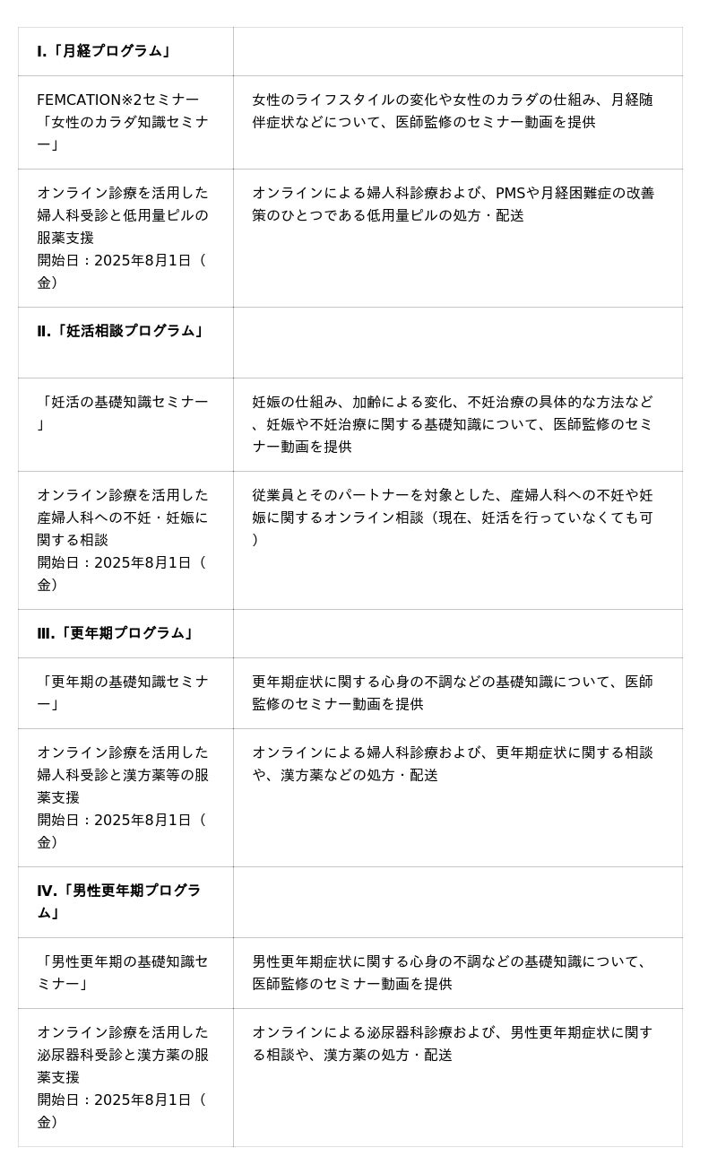 本プログラムを通じて荏原グループの従業員を対象に、医師監修のセミナー動画や、医療機関と連携したオンライン診療サービスの提供を行います。これにより、月経随伴症状や更年期症状の改善、不妊治療と仕事の両立などに関する不安の軽減を支援するとともに、性別やライフステージに応じた健康課題への全社的な理解促進を図ります。