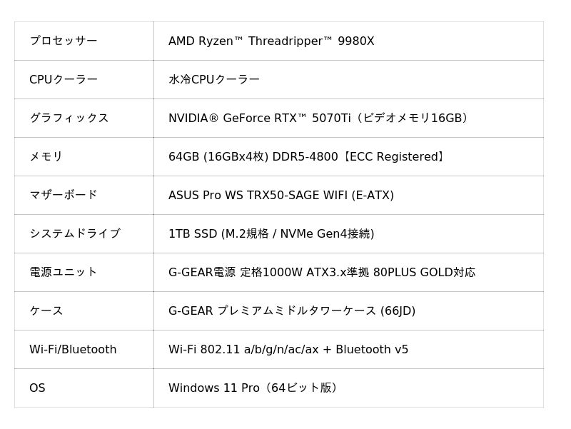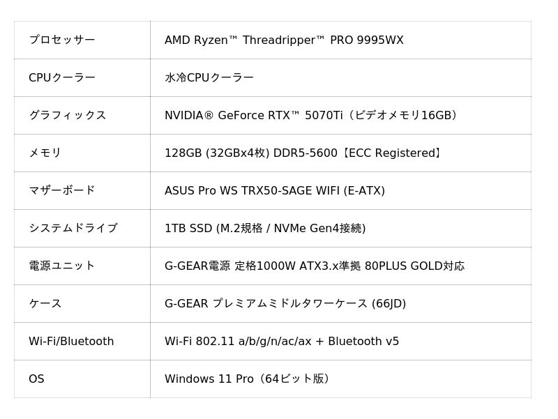 膨大なコア/スレッド数を持つAMD Ryzen(TM) Threadripper(TM) 9000 シリーズ プロセッサの性能を引き出す高性能マザーボード『ASUS Pro WS TRX50-SAGE WIFI』を採用しています。36フェーズからなる強力なVRM電源回路と大型のアルミニウムフィンを使用した冷却ソリューション、ヒートシンク付き Gen5対応 NVMe デュアルスロット、10 Gbポートと2.5GbポートのデュアルLANポート、 前面・背面にUSB3.2 Gen2x2 Type-Cポート、ECC Registeredに対応したDDR5メモリスロットなど、長期稼働を見据えたハイエンドデスクトップ・ワークステーションに相応しいマザーボードです。