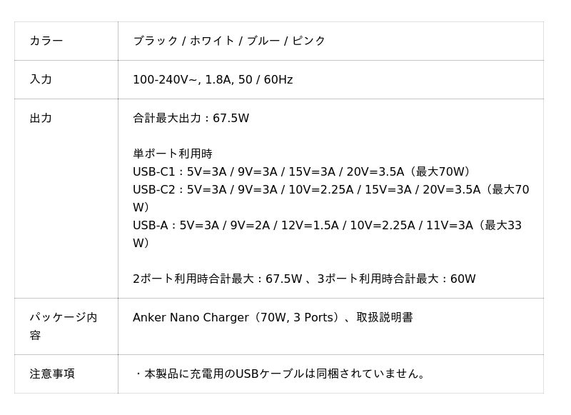 - パワフルな出力:最大70W出力に対応したUSB-Cポート2つと、USB-Aポートの合計3ポートを搭載。3台同時に充電する際も合計最大67.5Wと、MacBook Air等のノートPC、スマートフォン、その他のデバイスを3台同時に充電できます。
