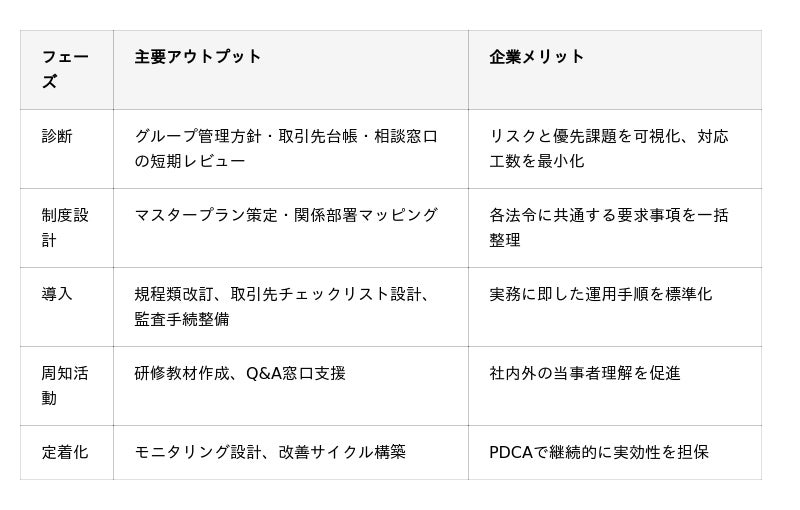 本サービスは、診断から制度設計・導入・周知・定着化までを一気通貫で支援し、法令遵守と取引の公正性を両立させることで企業の持続的成長に貢献します。