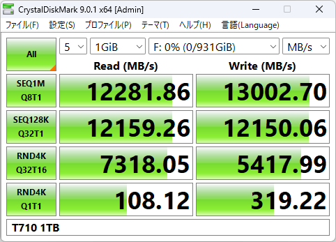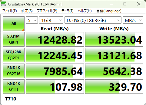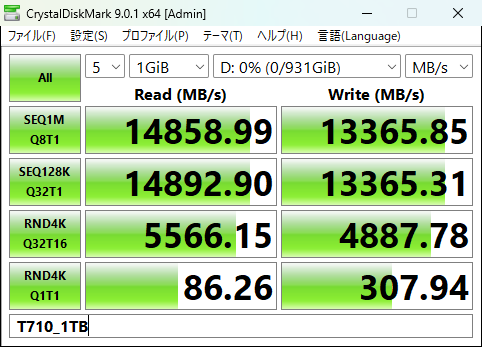結果は、シーケンシャルリードはいずれも公称値に肉薄する速度を叩き出した。シーケンシャルライトは1万3365MB/秒、1万3388MB/秒と、こちらは公称値から約400MB/秒下回っているが、「Crucial T710」本来の性能を遺憾なく発揮しているといえよう。
