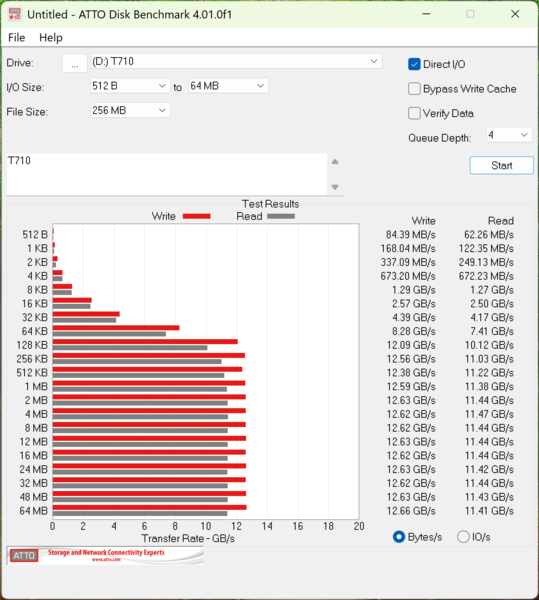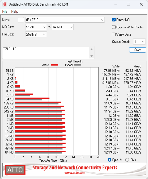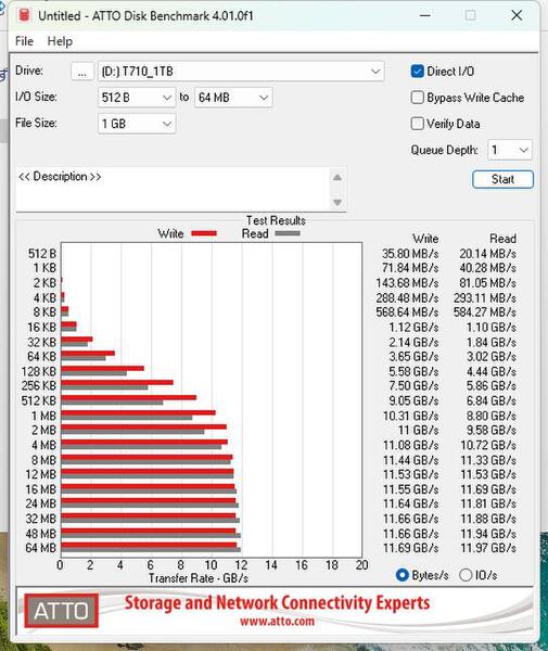 1TBモデルを「ATTO Disk Benchmark 4.01.0f1」でI/Oサイズ別に転送速度を計測。最大転送速度はAMD環境と大差ない結果になっている。1MBあたりから安定しておりインテル環境のほうが安定度は高そうだ