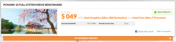 インテル環境においてストレージベンチマークテスト「PCMark 10 Full System Drive Benchmark」を実行してみた。結果はスコア5049と5000を超え、性能的には十分だ(2TBモデル)。「Crucial T700」での検証結果の記事によると、計測環境が環境はAMDではあるものの、スコアが3927のため、1000以上の差が付いている。シーケンシャルリードの性能としては変わらないものの、ほかの性能は大きく違っており、LGA1851プラットフォームであっても「Crucial T710」を選んだほうがパフォーマンスは高いと言える。