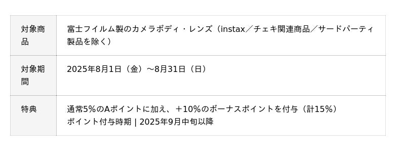 キャンペーンページURL:https://www.apex106.com/apex_news/202508_fujifilm-camera-and-lens-points-rebate-campaign.php