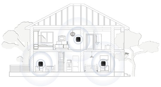 複数台を組み合わせて、メッシュWi-Fiを構築する場合も、自動で最適なWi-Fiネットワークが構築され、Wi-Fi機器同士の接続設定は不要です。また、電波が届く範囲を考えて適切な間隔でWi-Fi機器を配置するだけで、Wi-Fiネットワークの利用範囲を簡単に広げることができます。