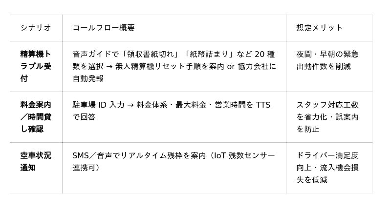 本テンプレートは、精算機トラブル・料金問い合わせ・空車状況確認といった 無人駐車場特有の問い合わせ 3 大領域 を 365 日 24 時間で自動対応することを目的に設計されています。