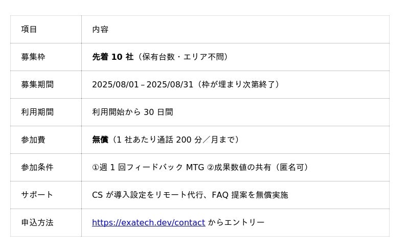 株式会社エクサテック(本社:岩手県盛岡市、代表取締役:大西 洋平太、以下「当社」)は、AI コールセンター支援サービス 「コルサポ」 において、コインパーキング運営向けテンプレート α版 を 2025 年 8 月 1 日より提供し、先着 10 社 を対象にパイロットプログラムへの参加企業を募集いたします。