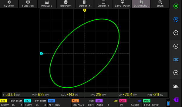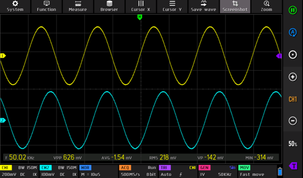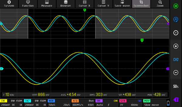評価や検証で活躍してくれるのが、「Save wave」と「Zoom」。「Screenshot」は、表示されている画面を画像として保存する機能ですが、Save waveは、表示している信号データそのものを保存する機能。そのため、あとからカーソル機能などで信号を調べることができますし、移動や軸設定を変更しての検証も可能です。表示の一時停止状態を保存できる、と考えればわかりやすいでしょうか。