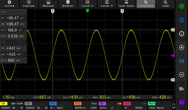 操作感に関しては後で説明するとして、機能面が結構優秀。デジタルオシロスコープらしく、最大・最小電圧や周波数、デューティー比などは常時画面に表示できます。また、カーソル機能を使えば、好きな範囲の数値を測ることも可能です。