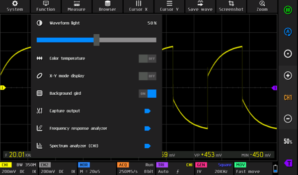 これを使うには、まず取り込みたい信号を画面に表示し、上部のメニューにある「Function」をタップ。「Capture output」を選び、取り込みたい範囲を設定したら、右端上部の保存ボタンを押します。