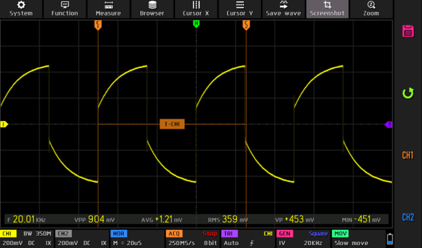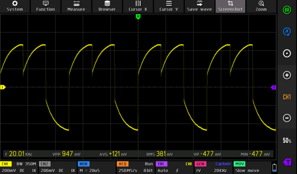 後は、波形の設定で「Capture」を選んで出力するだけ。これで、先ほど取り込んだ範囲の波形が繰り返し出力されるようになります。ちなみに、出力周波数の変更も可能。最大3MHzまで設定できました。