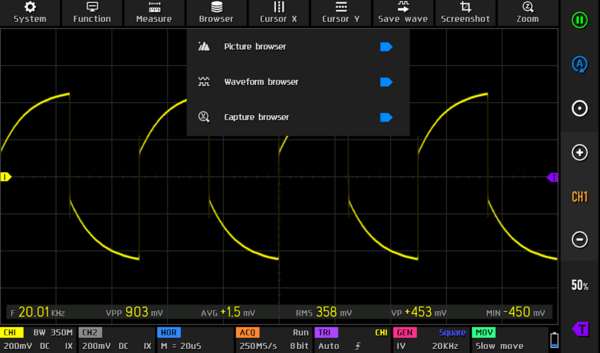 保存した信号を波形として使う場合は、上部の「Browser」から「Capture browser」を選択。すると取り込んだ信号一覧画面となるので、使いたいものをタップして「SET」マークを付けましょう。