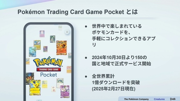 ポケポケは、世界中で楽しまれているポケモンカードを手軽にコレクションできるアプリだ。2024年10月30日に、150の国と地域で正式サービスをスタート。今年2月には、累計ダウンロード数が1億回を突破している。