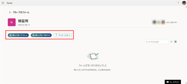 グループの画面が開くと、そこに「新しいグループ フォーム」というボタンが表示されています。ここからフォームを作成すれば、そのグループに属するグループフォームとなります。