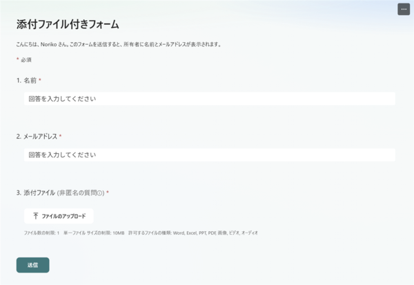 今回作るフォームを見れば分かるように、Microsoft Formsでは、回答時に添付ファイルをアップロードすることができます。このとき、個人フォームとグループフォームでは、アップロードファイルの保存先が異なります。