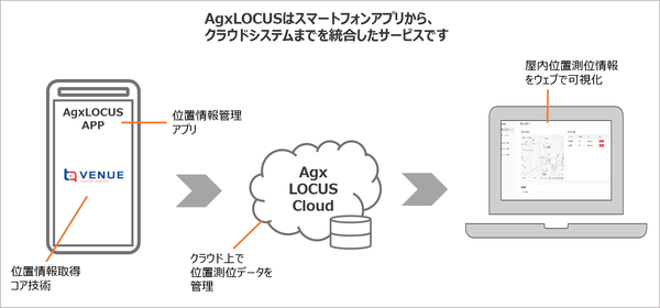 「AgxLOCUS」は、屋内位置を測定するためのスマートフォンアプリとデータ収集のためのクラウドサーバーで構成されており、利用ユーザーはスマートフォンのアプリで位置情報を取集し、クラウドと連携することでリアルタイムに位置情報を可視化。これによりユーザーはスマートフォンを持つだけで屋内での位置測位を実現することが可能になるという。