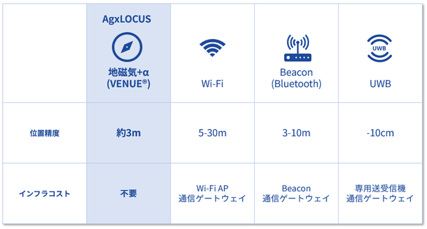 これに対して「AgxLOCUS」は、インフラ設備投資を行うことなく、位置測位を行うエリアの地磁気情報とスマートフォンアプリの機能により屋内位置測位を行うという。