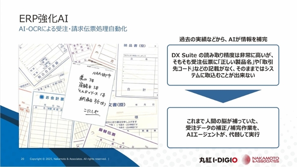 ひとつ目のソリューションは、AI-OCRによる受注・請求伝票の処理を自動化する「ERP強化AI」だ。「どのAI-OCRベンダーも未だ自動化を実現できていない。手書きの伝票を読み取れたとしても、『正しい製品名』や『取引先コード』などの記載がなく、データとして使えないのが実情」と清瀬氏。そこで、AI-OCRにRAGを組み合わせ、エージェントが過去の取引データから補正・補完して、ERPのデータとして処理できる仕組みを構築した。