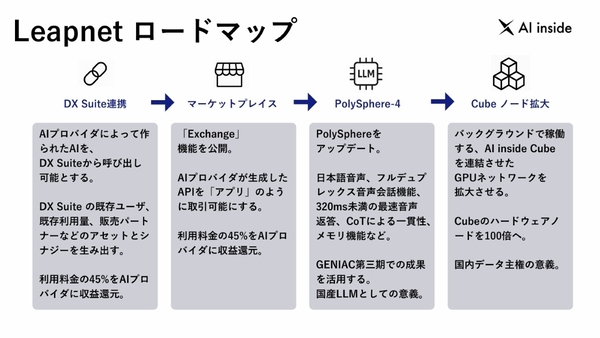 Leapnetを支える各技術への投資も継続する。国産LLMであるPolySphereでは、日本語でのフルデュプレックス(同時双方向)な音声会話などに対応するv4の開発を進めている。AI inside Cubeを連結させたGPUネットワークについても、ソブリンAIとしての需要にも応えるべく、ハードウェアノードを100倍へと拡大させる計画だ。