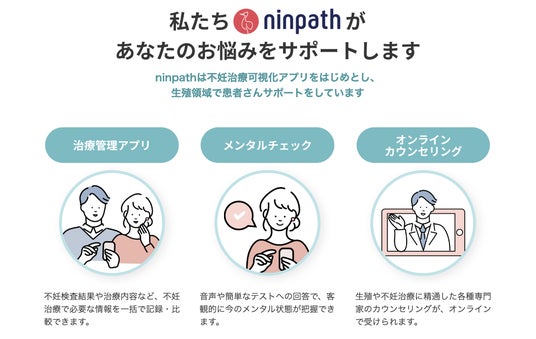 不妊治療の記録・管理はもちろん、ご自身の状況に近い第三者の治療データと比較することができる不妊治療可視化アプリです。子どもを望まれる方は年齢・身体の状態など、お一人お一人の状況が異なる上、医療機関によって不妊治療の治療方針が異なるのが現状です。そこで「ninpath」では、不妊治療の周期毎の記録・管理のみならず、ご自身に近い第三者の治療データ等と比較することで、自分自身の客観的な状況を把握することができ、今後の指針を考えるきっかけを提供しています。また、生殖に関する悩みなどを専門家がサポートするオンラインカウンセリングも提供しています。