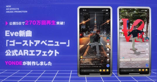 AR・SNSプロモーションを手がける株式会社YONDE(本社:福岡市中央区、代表取締役:田坂洋一 以下「YONDE」)は、株式会社インクストゥエンター(本社:東京都渋谷区)所属のシンガーソングライターEveによる新曲「ゴーストアベニュー」のプロモーション施策として、TikTok用ARエフェクト「AR Eve - ゴーストアベニュー」の制作を担当しました。