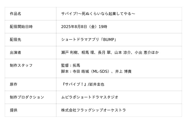 ショートドラマアプリ「BUMP」を提供するemole株式会社(本社:東京都目黒区、代表取締役:澤村直道)は、2025年8月8日(金)19時から株式会社フラッグシップオーケストラ(代表取締役:大澤 穂高)が制作する『サバイブ!~死ぬくらいなら起業してやる~』を独占配信します。
