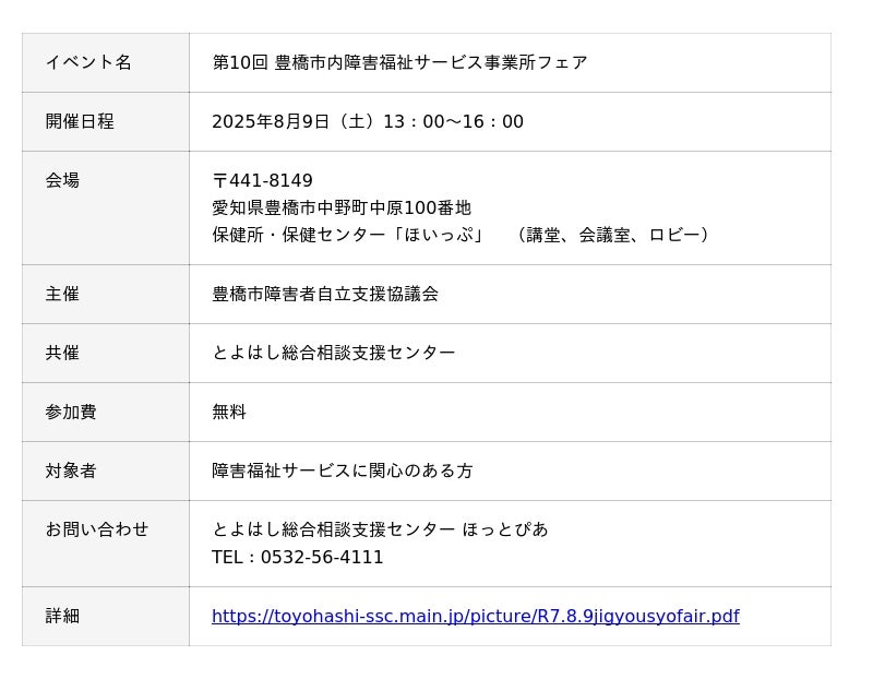 一般社団法人アイエスエフネットベネフィット(拠点:東京都港区、代表理事:渡邉幸義、以下アイエスエフネットベネフィット)は、2025年8月9日(土)に愛知県豊橋市で開催される「障害福祉サービス事業所フェア」に出展し、障がい者就労支援事業についてご紹介いたします。