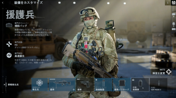 本作では、「アサルト(突撃兵)」「エンジニア(工兵)」「サポート(援護兵)」「リコン(斥候兵)」の4つのクラスが復活しました。