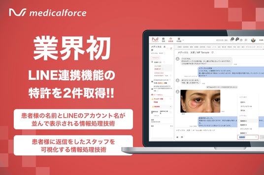 「medicalforce」上でカルテとLINEのAPI接続を行い、「患者様の氏名とLINEアカウント名が並んで表示される情報処理技術(特許第7701092号)」および「どのスタッフが患者様に返信したかを可視化する情報処理技術(特許第7714262号)」に関して、特許を取得したことをお知らせいたします。