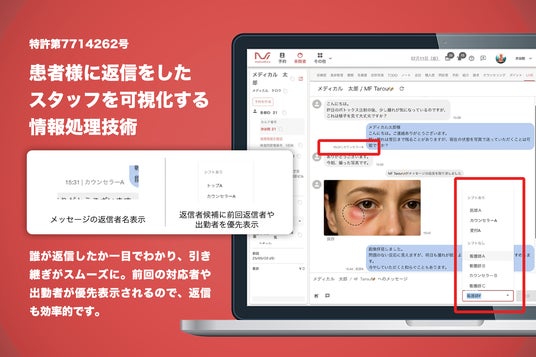 本特許技術により、患者様とのやりとりをカルテ画面上で一元管理し、スタッフごとの返信者情報を識別できるようになります。
