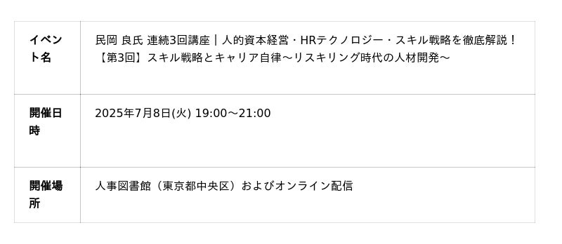 株式会社Trustyyle(本社:東京都中央区・代表取締役:吉田洋介)は、2025年7月8日にコミュニティ「人事図書館」にて、【民岡 良氏 連続3回講座|人的資本経営・HRテクノロジー・スキル戦略を徹底解説!【第3回】スキル戦略とキャリア自律~リスキリング時代の人材開発~】を開催しました。人的資本経営とHRテクノロジーの第一人者である民岡良氏による「スキル戦略とキャリア自律」に関する講演や、参加者との活発な質疑応答が行われ、盛況のうちに終了しました。本記事では、イベント当日の様子や成果についてご報告します。