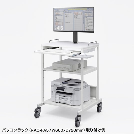 省スペースに取り付けできるので、パソコンラックに取り付けてモニターごと移動する使い方もできます。