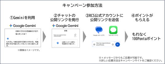 お客さまは、日常のさまざまなタスクや疑問をサポートするGeminiをキャンペーンサイトから利用し、Google メッセージ/iOS メッセージアプリから、専用のRCS公式アカウントにGeminiで発行した公開リンクを共有いただくと、もれなくポイントがもらえます。