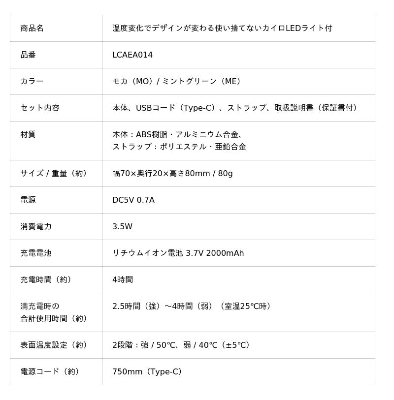 「温度変化でデザインが変わる使い捨てないカイロLEDライト付」LCAEA014