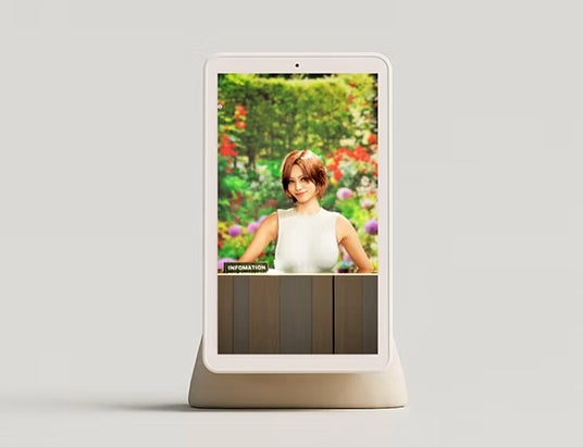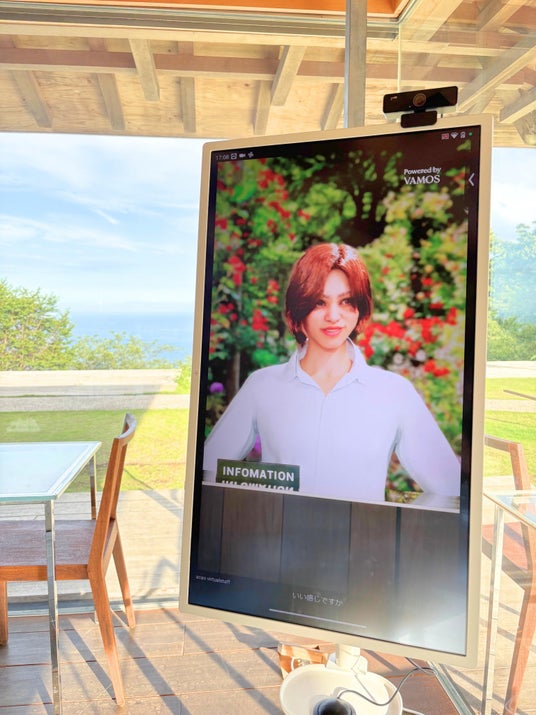 施設内に設置された32インチの大型ディスプレイには、遠隔地から操作されるアバターがリアルタイムに登場。操作者の顔の動きや表情を忠実に反映することで、温かみのある接客体験を実現します。
