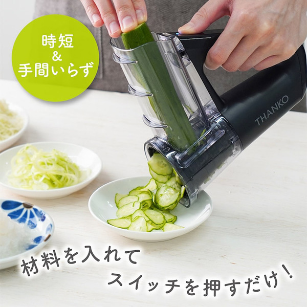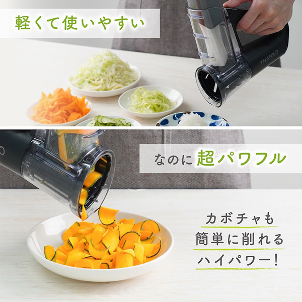 「オロスラ」は電動で手軽に様々な野菜をスライス。軽量かつコンパクトで収納場所を取りません。