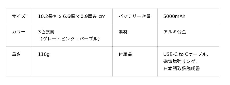 厚さわずか8.6mm、重さは約110gという超軽量・超薄型設計ながら、5000mAhの容量を備えた、まさに“持ち歩くのを忘れるほど”の一台です。