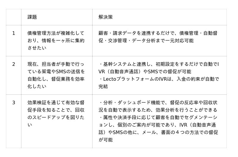 Lecto株式会社(本社:東京都渋谷区、代表取締役社長:小山 裕、以下「Lecto」)は、株式会社エース・オートリース(本社:東京都品川区、代表取締役社長:久我 紳也、以下「エース・オートリース」)が、債権管理および督促・回収業務をデジタル化・自動化する「Lectoプラットフォーム」を導入したことをお知らせいたします。