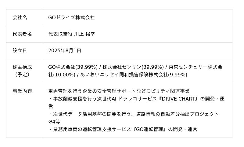 また、GOでは、企業の安全管理領域における事業成長を加速させるため、『DRIVE CHART』事業などを承継する新会社、GOドライブを2025年8月1日(金)に設立しました。GOドライブには、第三者割当増資による株式会社ゼンリン(代表取締役社長:竹川 道郎、以下「ゼンリン」)および東京センチュリー株式会社(代表取締役社長:藤原 弘治、以下「東京センチュリー」)が資本参加を予定しています。今般、協業体制の構築および新たなデータビジネスモデルの開発を通じて、安全・安心なモビリティ社会・まちづくりへの貢献を目指し、この度、あいおいニッセイ同和損保も資本参加することとなりました。