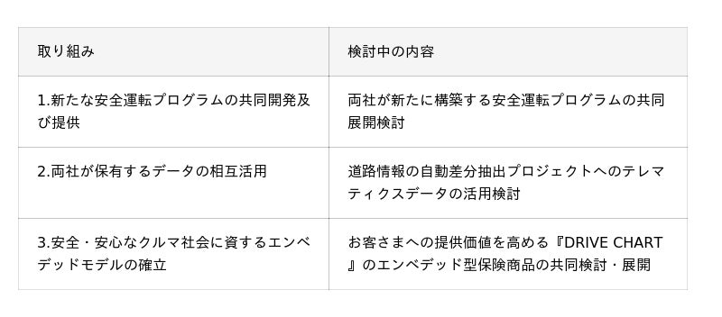 GOドライブが推進する『DRIVE CHART』や『GO運転管理』、ゼンリンと共同で進める道路情報の自動差分抽出プロジェクトなどの事業に、あいおいニッセイ同和損保のCSV×DXの代表商品であるテレマティクス自動車保険のデータ・ノウハウを掛け合わせた共同取り組みを実施します。