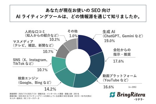「現在使っているSEO向けAIライティングツールは、どの情報源を通じて知ったか」を尋ねる設問への回答では、1位が「生成AI(ChatGPT、Geminiなど)」で19.0%、2位が「会社からの指示・推奨」で17.6%、3位が「動画プラットフォーム(YouTubeなど)」で16.6%、「検索エンジン(Google、Bingなど)」は14.2%で4位という結果になりました。