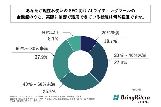 - 現在使っているSEO向けAIライティングツールの全機能のうち、実際に業務で60%以上の機能を活用できている人の割合は4割未満