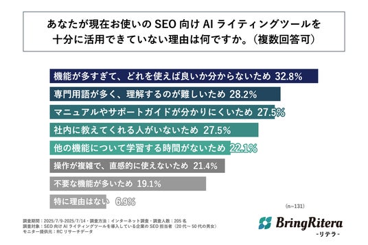 また、現在使っているSEO向けAIライティングツールの全機能のうち、実際に業務で機能を十分に活用できていない人(20%未満、20%~40%未満、40%~60%未満と回答した人)を対象に「現在使っているSEO向けAIライティングツールを十分に活用できていない理由」を尋ねる設問への回答では、1位が「機能が多すぎて、どれを使えば良いか分からないため」で32.8%、2位が「専門用語が多く、理解するのが難しいため」で28.2%、3位が同率で「マニュアルやサポートガイドが分かりにくいため」と「社内に教えてくれる人がいないため」で27.5%でした。現在使っているSEO向けAIライティングツールを十分に活用できていない理由で最も多いのは、「機能が多すぎて、どれを使えば良いか分からないため」という結果となりました。