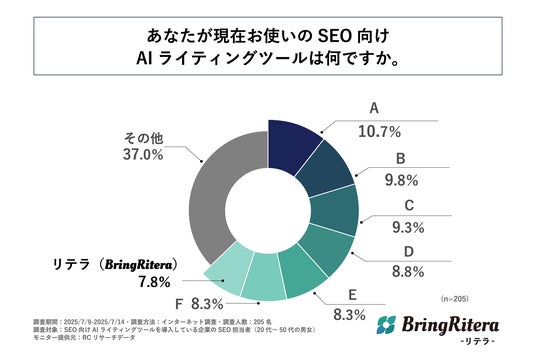 次に「現在使っているSEO向けAIライティングツール」を尋ねたところ、1位が『A』で10.7%、2位が『B』で9.8%、3位が『C』で9.3%、7位の『リテラ(BringRitera)』で7.8%と、1位と7位の差が3%未満という結果になりました。SEO向けAIライティングツールを導入している企業のSEO担当者が、現在使っているSEO向けAIライティングツールは様々であると言えます。