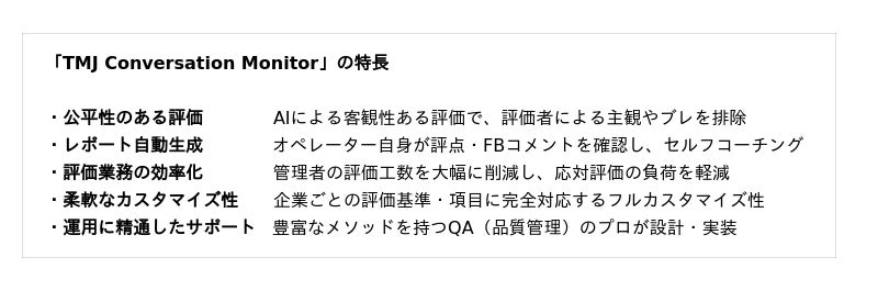 音声認識技術による会話の自動テキスト化、要約・分類化を可能とする既存サービス「TMJ Speech Scripter※3」から、オペレーターの応対自動評価機能のみを切り出しサービス化。生成AIによる客観的評価でオペレーターのセルフコーチングを促すと共に、人の手では対応が困難であった全件応対評価を可能にすることで、コンタクトセンターの品質・生産性向上に大きく貢献します。