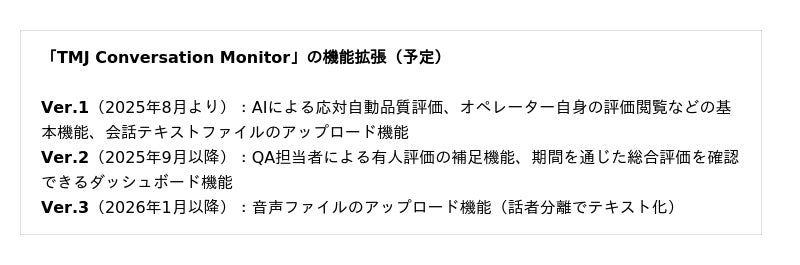 なお、本サービスには、QA(品質管理)担当者による有人評価の補足機能、期間を通じた総合評価を確認できるダッシュボード機能、音声ファイルをアップロードできる機能などを、2025年9月以降より順次拡張していく予定です。